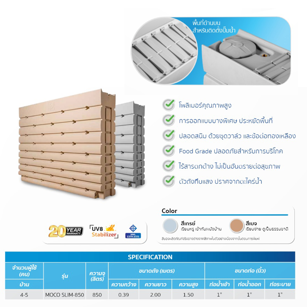 -ติดตั้งปั๊มน้ำบนตัวถังได้ มีแท่นวางปั๊มในตัวพร้อมฝาครอบปั๊ม ช่วยประหยัดพื้นที่ติดตั้งและปกป้องปั๊มน้ำจากน้ำท่วม