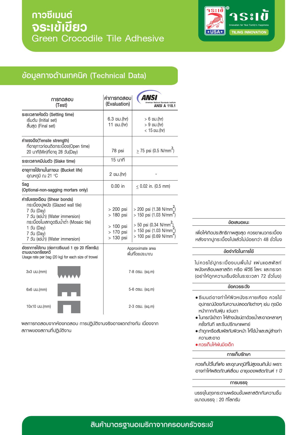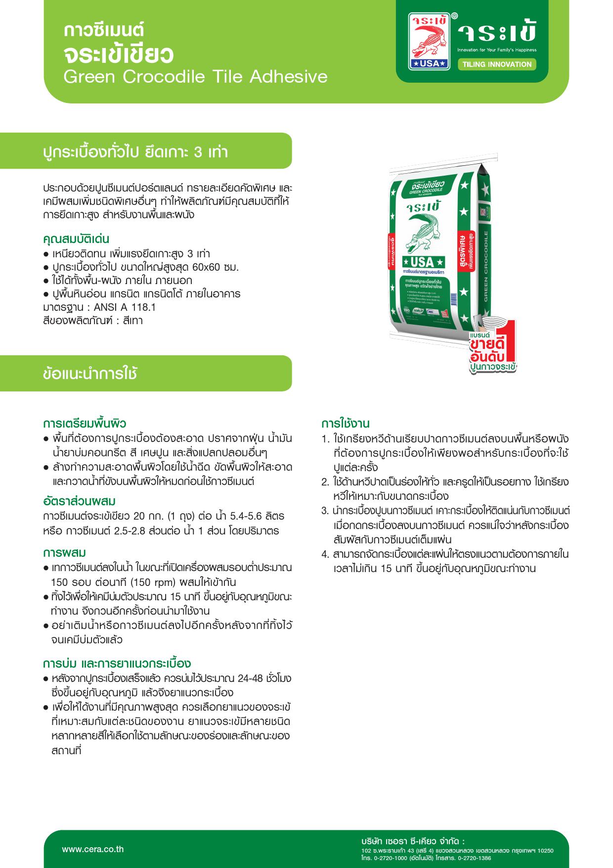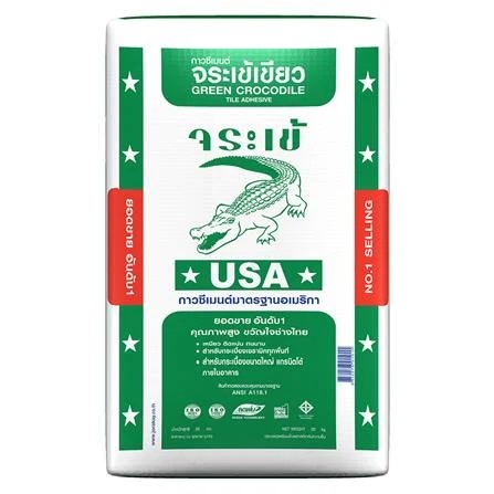 กาวซีเมนต์จระเข้เขียว ให้การยึดเกาะสูง สำหรับงานปูกระเบื้องเซรามิกทั่วไป กระเบื้องดูดซึมน้ำต่ำ ใช้ได้ทั้งพื้นและผนังภายในอาคาร โดยไม่ต้องแช่กระเบื้องในน้ำก่อนปู