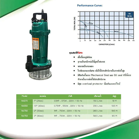 1. เหมาะสำหรับใช้จุ่มลงในแหล่งน้ำเพื่อดูดน้ำจากบ่อ, อ่าง หรือบึง