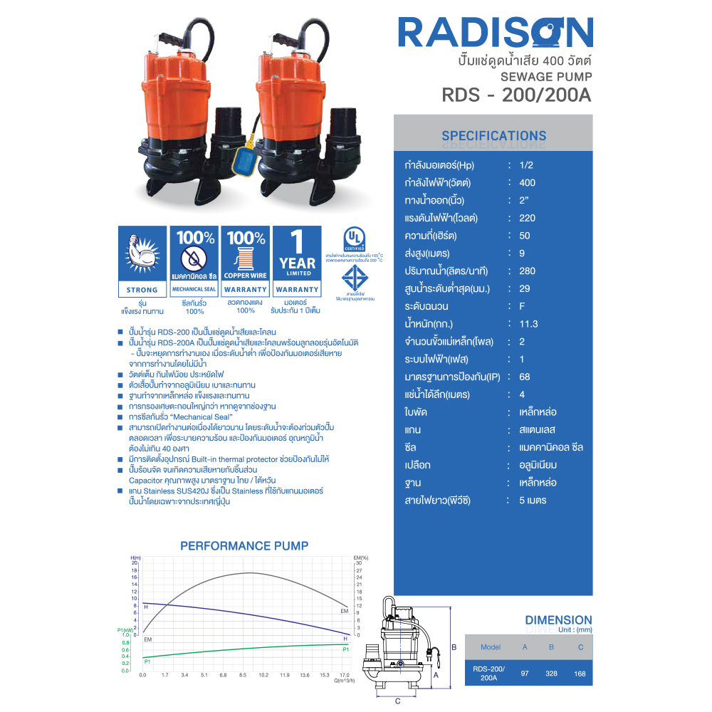 – ปั๊มน้ำรุ่น RDS -200 เป็นปั๊มแช่ดูดน้ำเสียและโคลน