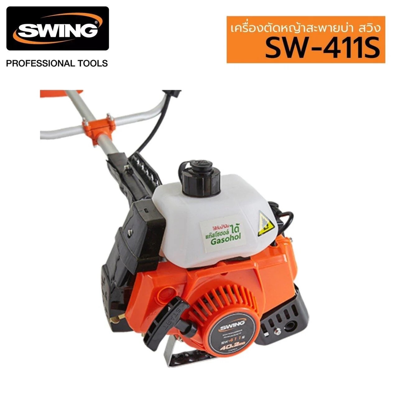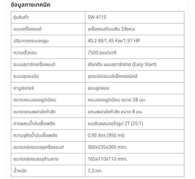 เครื่องตัดหญ้าสะพายบ่า เป็นเครื่องยนต์ 2 จังหวะ 1 สูบ ระบายความร้อนด้วยอากาศ ต้องใช้น้ำมันเบนซิน 91 (หรือ แก๊สโซฮอลล์ 91) ผสมกับน้ำมันออโต้ลูป (2T) ในอัตราส่วน 25 : 1 คาร์บูเรเตอร์ (Float Type) เป็นระบบเข็มลูกลอย ถังน้ำมันอยู่ด้านบน เครื่องติดง่าย น้ำมันไหลจากด้านบนลงมา ไม่ต้องดุดกังวลน้ำมันอุดตัน กำลังแรง 40.2CC ใช้กับน้ำมันแกสโซฮอล์ได้ สตาร์ทติดง่ายด้วยระบบEasy Start ระบบลานสตาร์ทขนาดใหญ่เบาแรง ลูกสูบ+แหวน+ ข้อเหวี่ยงคุณภาพสูง แกนเพลขนาดใหญ่ 6มม. กระบอกแกนคัดพิเศษใหญ่28มม.